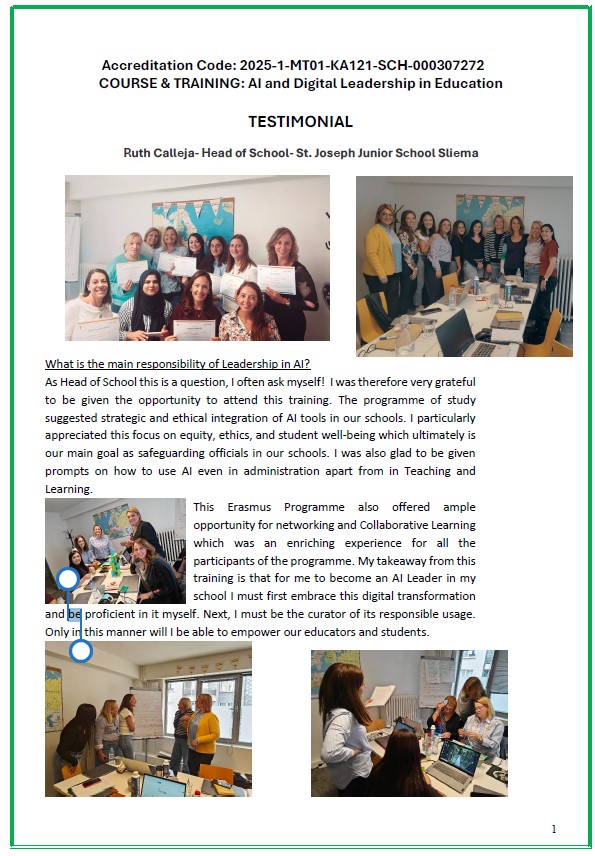 I am an ICT teacher at St. Joseph Junior School in Sliema, and I recently attended a three-day seminar in Budapest focused on the application of artificial intelligence in education. This experience proved to be highly enriching, allowing me to deepen my understanding of AI technologies. On the first day, I explored various chatbots that can be utilized in the classroom. I also gained insights into the significance of creating effective prompts to achieve desired outcomes, along with an overview of fundamental AI terminology. The second day provided me with valuable knowledge about a range of AI tools suitable for educational purposes. Among these tools are: Suno.ai: for generating songs; Toolsaday: for character creation; Ideogram.ai: for image generation; Microsoft Designer: for photo editing, Elevenlabs.io: for converting text to speech; Sketch Metademo Lab: for scanning and animating images. On the third day, the focus shifted to utilizing AI for assessment purposes. We examined how to create rubrics, quizzes, lesson plans, PowerPoint presentations, and flashcards. One of the tools I plan to implement during the first term is Sketch Metademo Lab. I will integrate this tool with a coding lesson, where I will teach students the concept of algorithms. After explaining algorithms, students will receive a set of instructions to draw a friendly monster. Once their drawings are complete, I will use Sketch Metademo Lab to scan the monsters, and the students will be excited to see their creations animated on the screen. Overall, this seminar has significantly enhanced my knowledge, and I am eager to incorporate the AI tools I have learned about to benefit my students’ learning experiences.