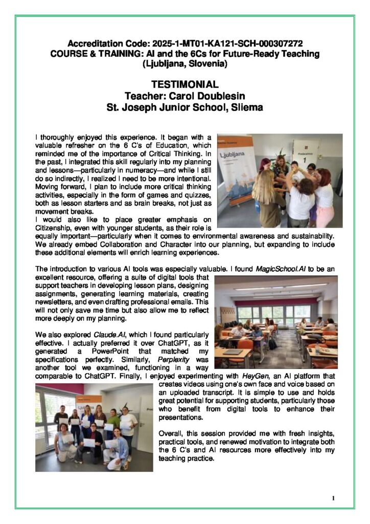 Follow-up AI Training in Budapest – by Francesca Cilia (Grade 4 teacher)Participating in this training course was a very rewarding experience that greatly expanded my knowledge and skills in using AI tools in the classroom. I was introduced to various websites beyond ChatGPT, such as Claude, Gemini, Magic School, and Padlet, which broadened my understanding of how AI can support innovative teaching methods. I learned how to use Padlet effectively, particularly the “I can’t draw” feature, which encourages students to express ideas visually. One of the most useful skills I acquired was using AI character generators, which I plan to integrate into creative writing lessons, allowing students to bring their imagined characters to life. Furthermore, I discovered Ideogram, a tool that helps create images for complex concepts, which will be valuable for visualizing abstract topics in class. Perhaps the most exciting tool I encountered was Suno.ai, which can generate songs on any topic, such as composing a song about the planets to make lessons more engaging and memorable. The course concluded with us creating a comprehensive lesson plan using multiple AI tools, which was a true eye-opener. This hands-on activity demonstrated the immense potential of AI in education, making it an invaluable learning experience.